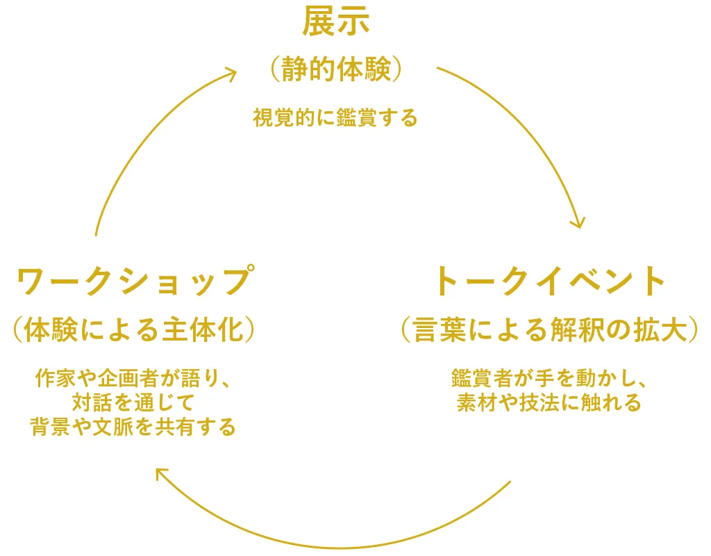 本企画展では、展示を鑑賞してもらうだけではなく、より深い理解を得るためにその構造を「作品そのものを味わう場」(展示)、「言葉を通じて理解を深める場」(トークイベント)、「体験を通じて共創する場」(ワークショップ)の3つに分けての実施を予定しています。この三層が重なり合うことで、展覧会は「静的な鑑賞」から「動的な学びと交流」へと拡張し、より豊かな文化的体験を生み出すことを目指しています。それぞれの構造を単独で成立させつつも連動性を持たせることで、知識の深化を図り「香りの視覚化」とともに自身の心地よさを見つける機会を提供したいと考えています。